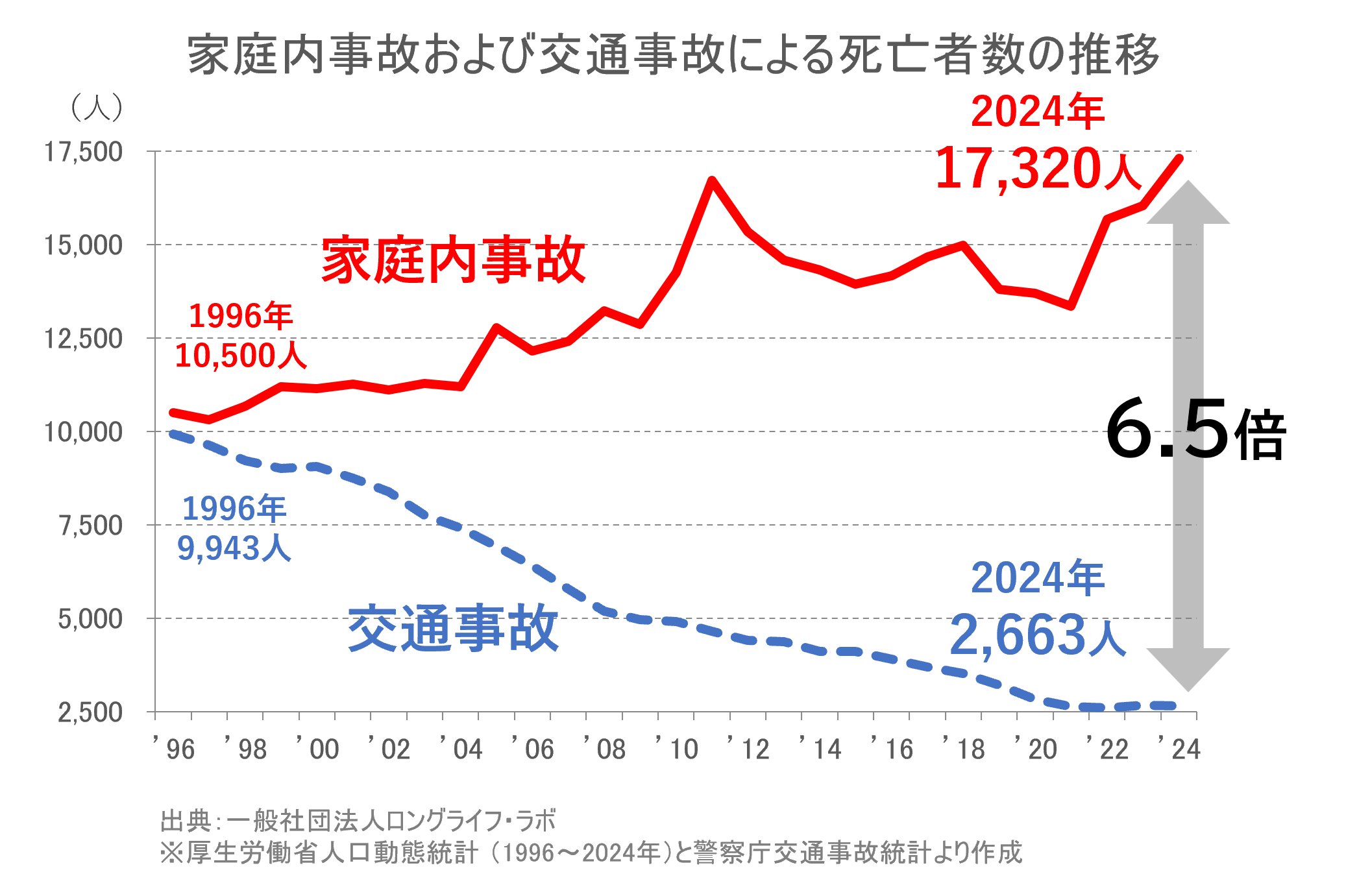 2024年に家庭内事故で亡くなられた方は17,320名で、交通事故で亡くなられた方の6.5倍となっています。
