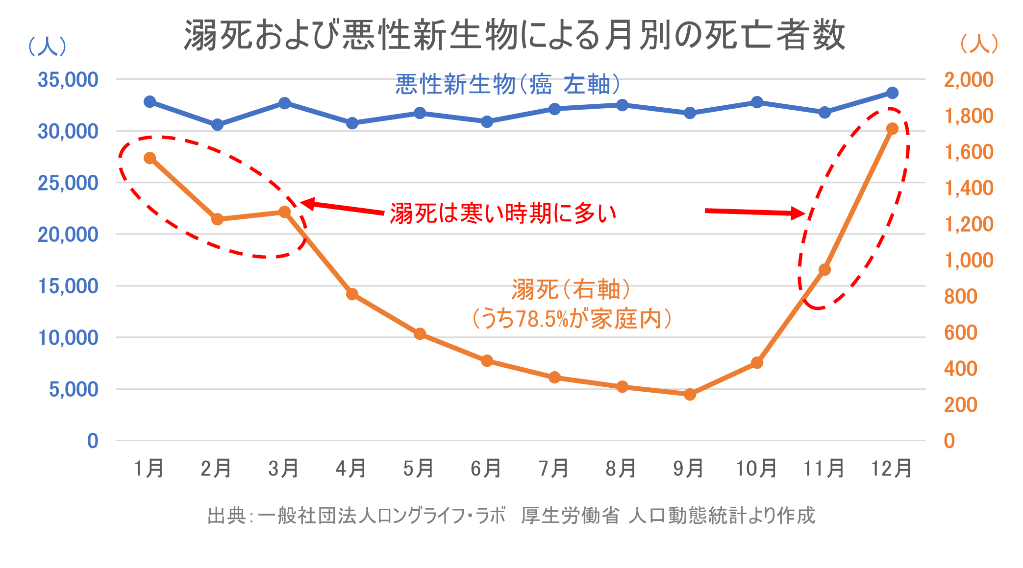 溺死のうち78.5%が家庭内で起こっていることと、冬季に増加することから浴室内でのヒートショックによるものと考えられます。