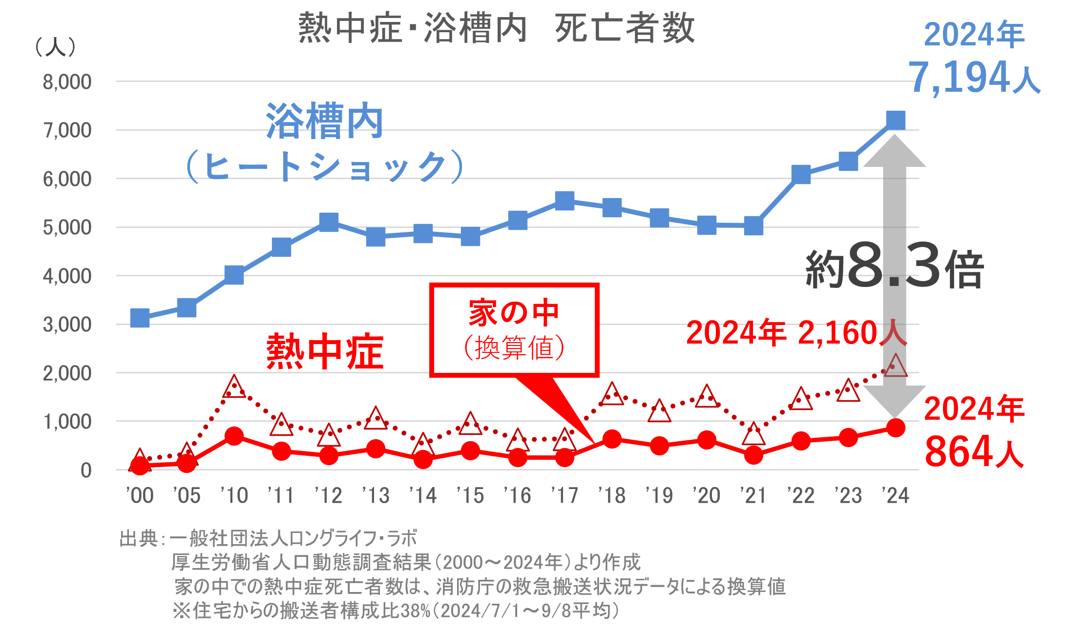 また、浴槽内のヒートショックで亡くなられる方も増加しており、2024年には7,194名と昨年を大きく上回っています。脱衣室・浴室での暖房機器の使用や断熱改修など、温度差を縮めるための対策を、熱中症対策と同じように広く知っていただくことが必要です。