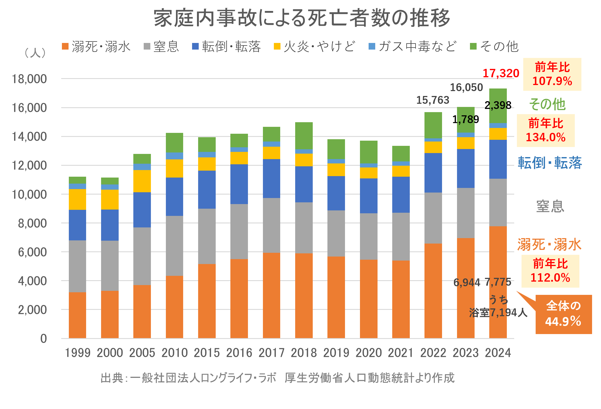 2023年に家庭内事故で亡くなられた方は16,050名と、2022年の15,763名に比べて101.8%、287名の増加でしたが、2024年は17,320名となり、2023年に比べて107.9%、1,270名の増加と大幅に増えています。