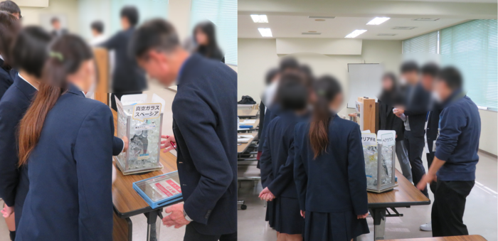 ワークショップでは、住宅の断熱性能を体感する実習として、氷を入れた水槽に単板(1枚)ガラスや真空ガラスを設置し、それぞれの温度の伝わり方の違いを比較体験しました。生徒の皆さんは、ガラスの種類による断熱性の違いを実感し、省エネ住宅の重要性を肌で学びました。