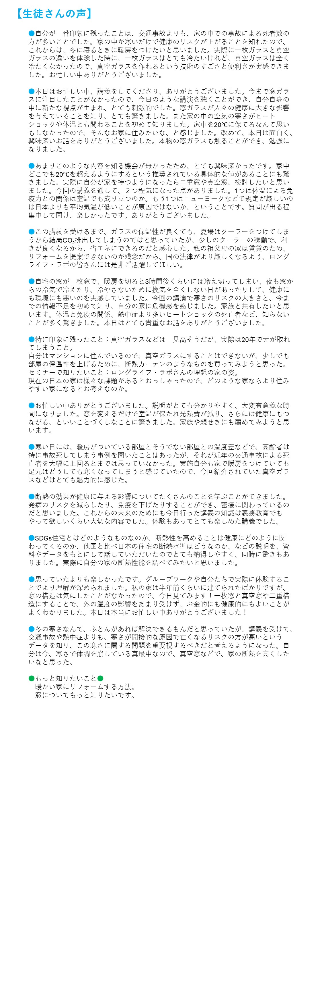 ●冬の寒さなんて、ふとんがあれば解決できるもんだと思っていたが、講義を受けて、交通事故や熱中症よりも、寒さが間接的な原因で亡くなるリスクの方が高いというデータを知り、この寒さに関する問題を重要視するべきだと考えるようになった。