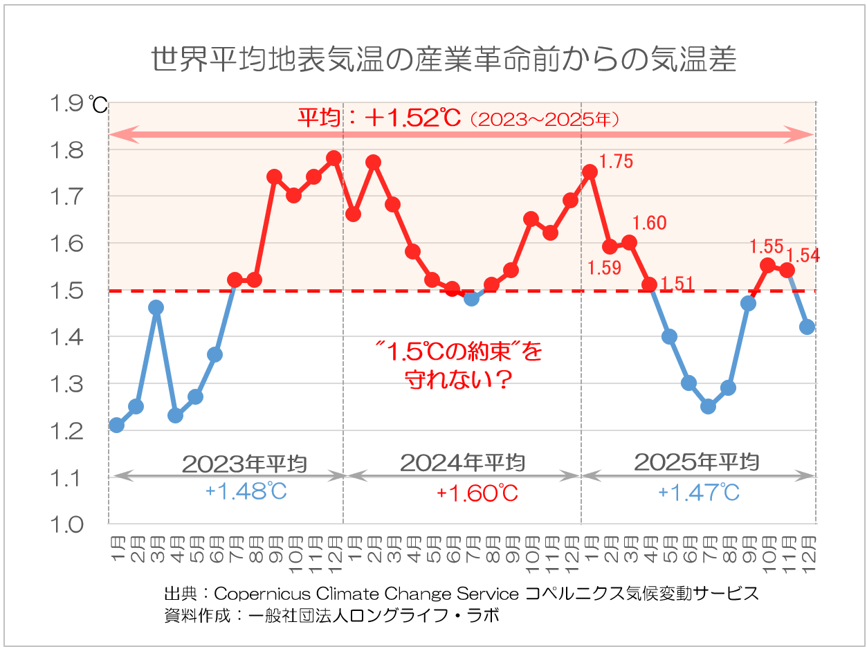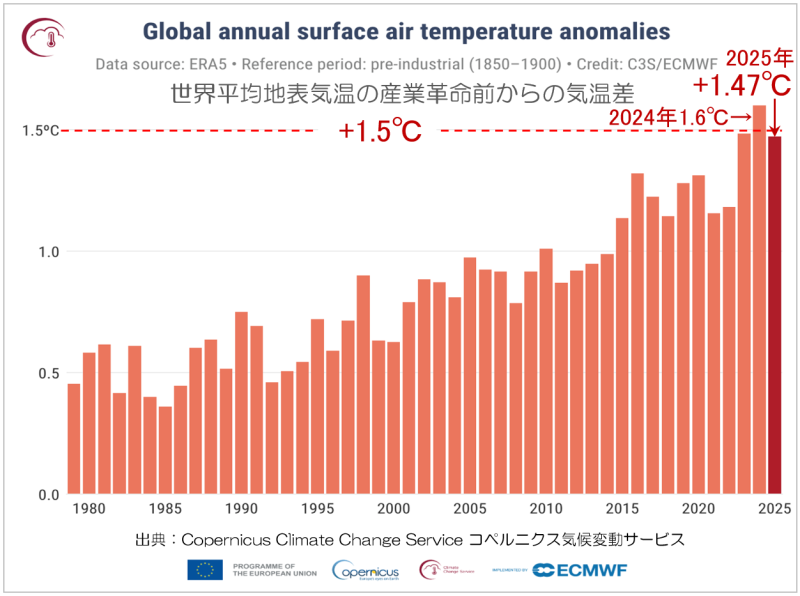 先日(2026年1月14日)、コペルニクス気候変動サービスから、2025年の世界平均気温が発表され、 産業革命前比で +1.47℃ であったことが明らかになりました。1.5℃という超えてはいけないラインをわずかに下回ったものの、この数字が示すのは「安心」ではなく、むしろ地球が危険域のすぐ手前に立ち続けているという厳しい現実です。2024年には、世界平均気温が +1.6℃ に達し、人類史上最高を記録しました。これは、人類が掲げてきた『1.5℃の約束』(パリ協定で合意された気温上昇の抑制目標)を年間平均として初めて超えてしまった年でもあります。