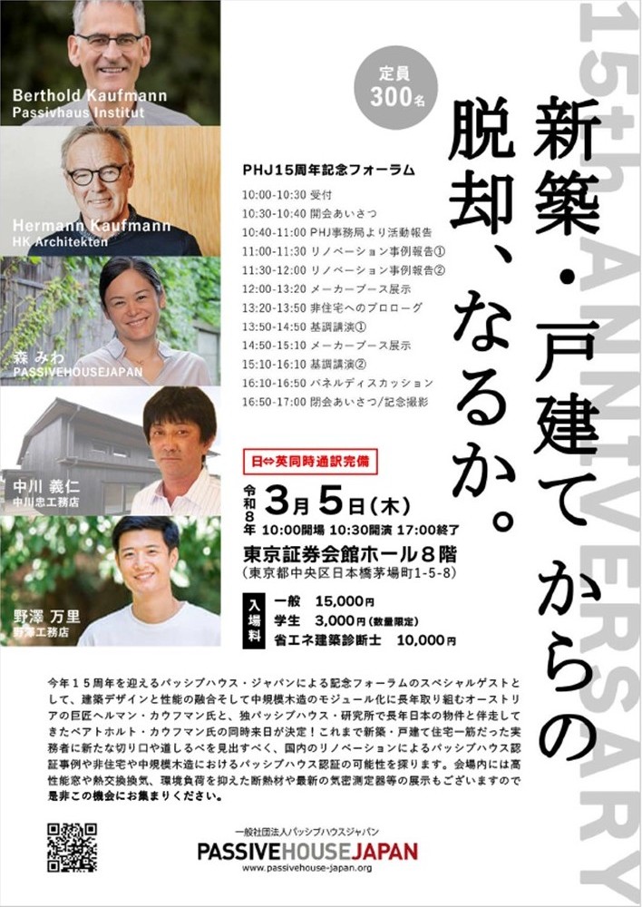 【ご案内】パッシブハウス・ジャパン15周年記念フォーラムが3月5日(木) に開催されます!